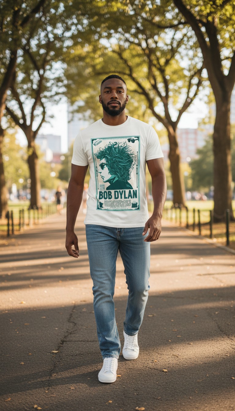 Hay artistas que no solo cantan, sino que narran la historia, y Bob Dylan es el máximo referente. Ciervo Negro presenta esta pieza para los coleccionistas de momentos culturales. El diseño utiliza una paleta de colores retro y elementos gráficos que evocan la época dorada del Greenwich Village, incluyendo detalles como una armónica, gafas oscuras y una máquina de escribir. No es solo una camiseta; es un tributo a la palabra escrita y al sonido que cambió el mundo.