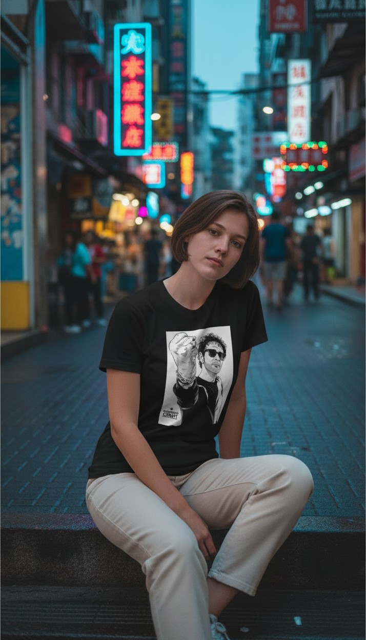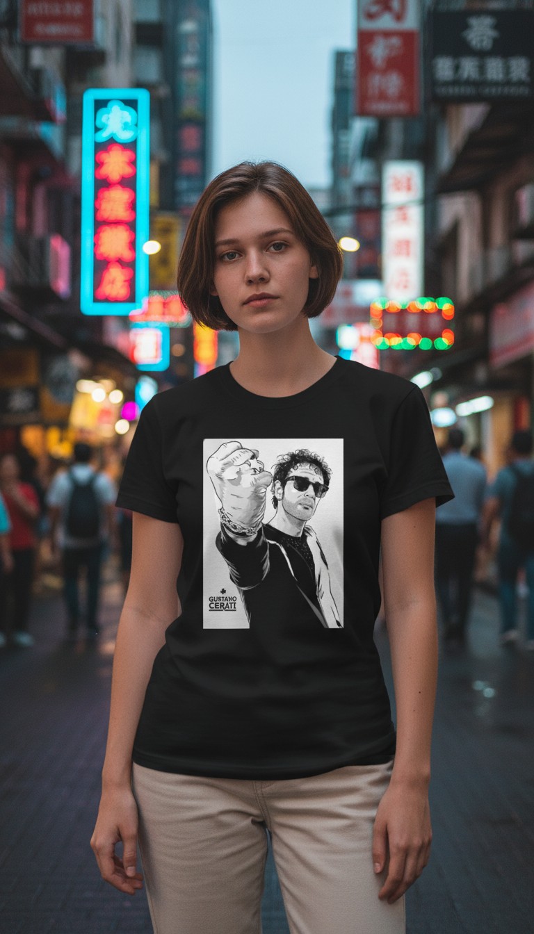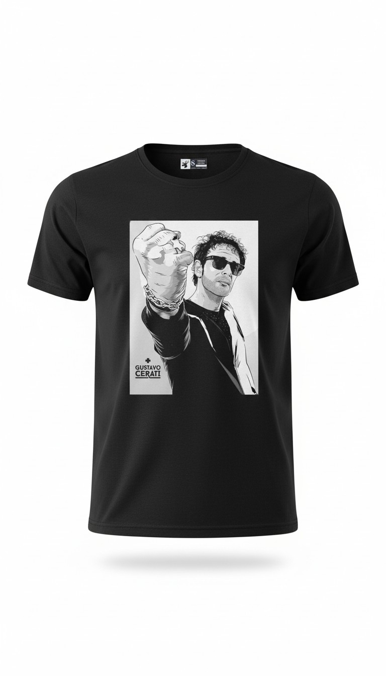 Gustavo Cerati no solo cambió la música; cambió la estética de toda una generación. Ciervo Negro presenta esta pieza para quienes llevan sus letras como un mantra de vida. El diseño se centra en un retrato de autor en escala de grises, resaltando la intensidad de su mirada y el gesto de su puño, simbolizando el poder de su presencia en el escenario. Una composición minimalista y potente que convierte un icono del rock en una pieza de moda urbana de alto nivel.