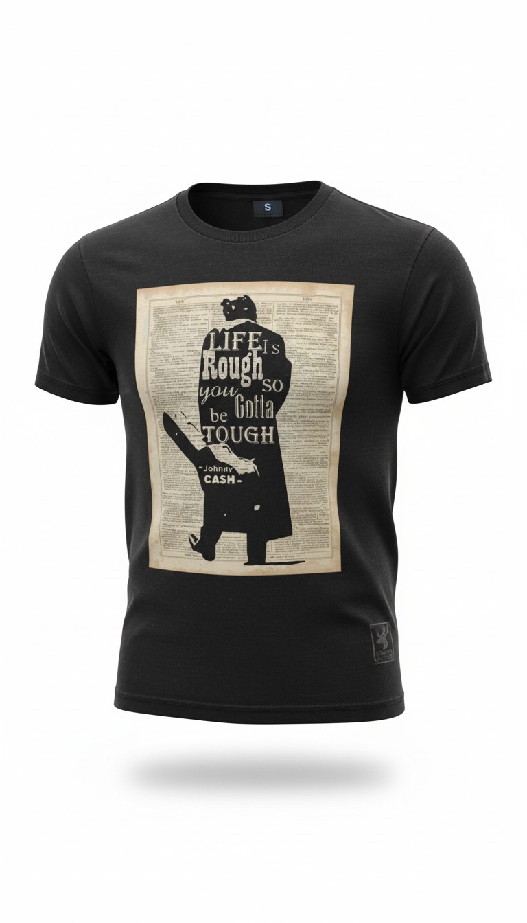 Johnny Cash no solo fue un cantante; fue la voz de los olvidados, los rebeldes y los que buscan redención. Ciervo Negro presenta esta pieza exclusiva que inmortaliza al artista en su pose más característica: caminando solo con su guitarra hacia el siguiente escenario. El diseño utiliza una estética de “newsprint” envejecido, otorgando un aire histórico y auténtico que resalta la profundidad del mensaje que definió su vida y carrera. Es una prenda diseñada para quienes prefieren la honestidad del negro profundo y la fuerza de las palabras directas.