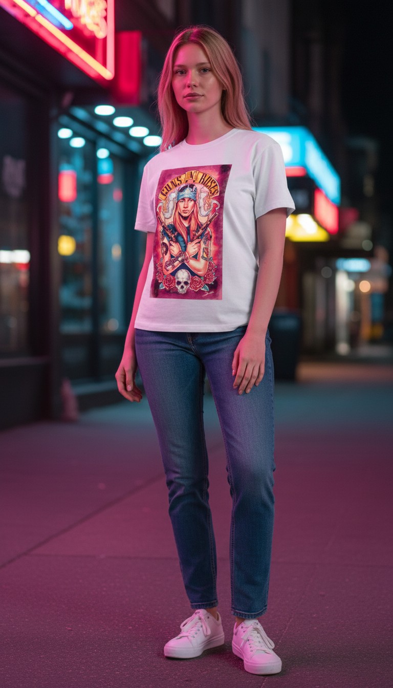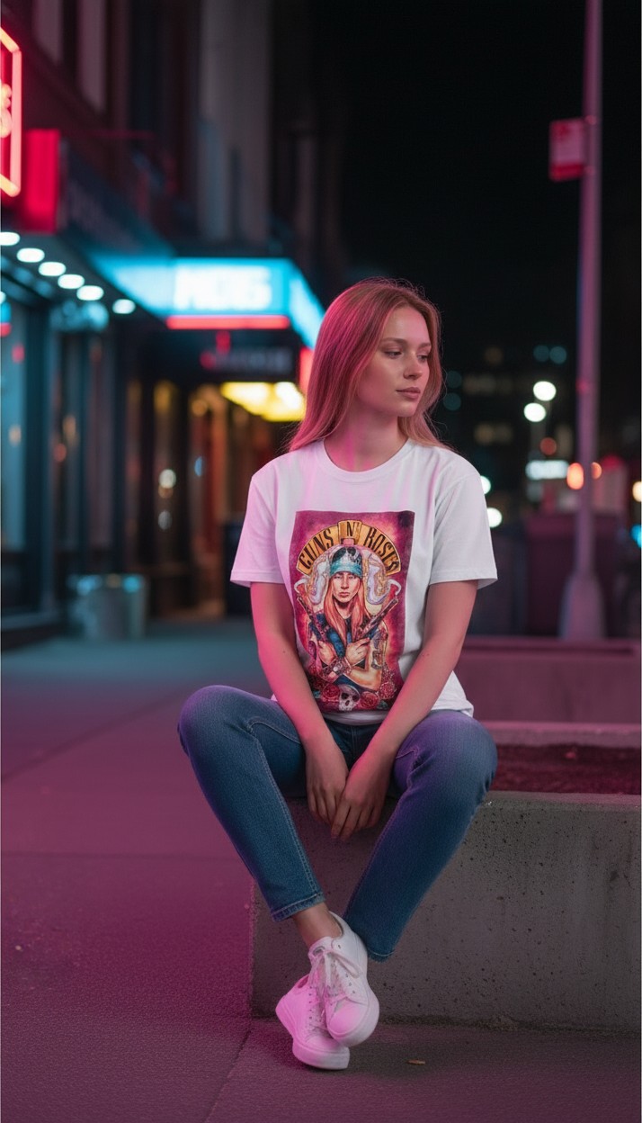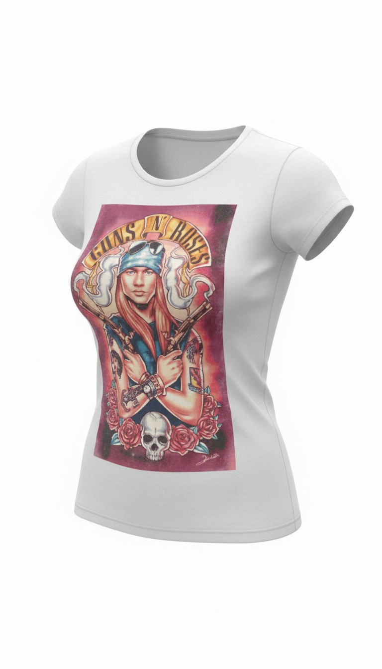 Hay voces que definieron una generación, y la de Axl Rose es el eco de una rebeldía eterna. Ciervo Negro presenta esta pieza exclusiva diseñada para la mujer que busca una estética rockera sofisticada. El gráfico destaca por su vibrante paleta de magentas y rojos, fusionando el retrato del líder de la banda con la simbología clásica de las pistolas y las rosas. Un diseño con fuerza visual que convierte una camiseta básica en una pieza de colección.