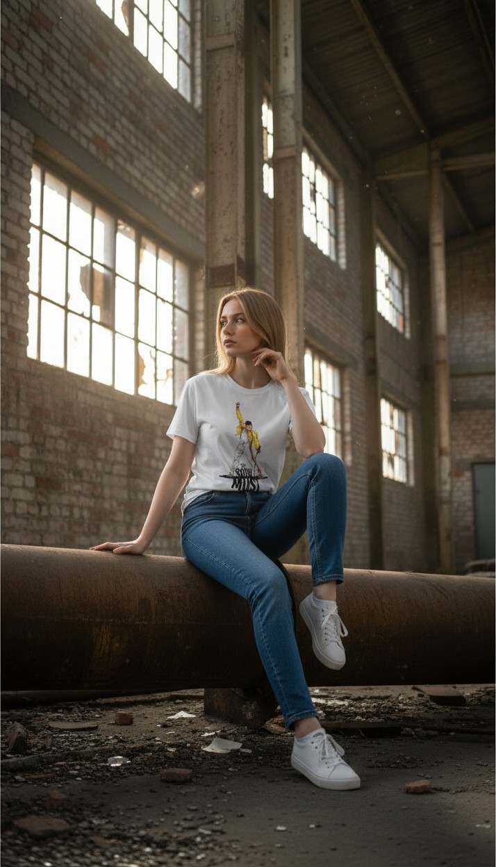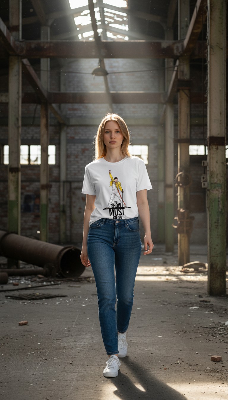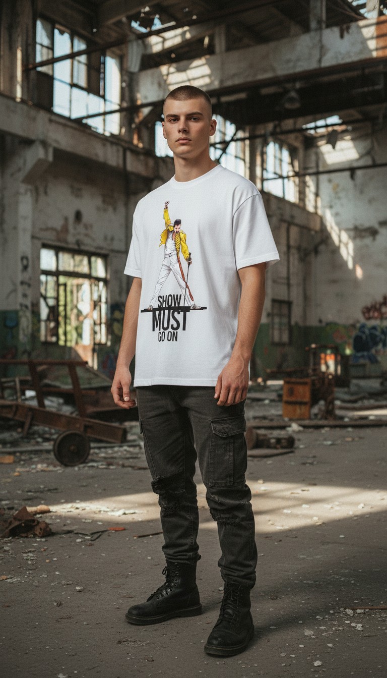 Pocas imágenes en la historia de la música son tan potentes como la de Freddie Mercury dominando el escenario. Ciervo Negro presenta esta pieza de diseño independiente que rinde tributo a la fuerza vital de Queen. El gráfico destaca por su fidelidad cromática, enfocándose en el contraste entre el blanco óptico de la prenda y el amarillo vibrante de la chaqueta de Freddie, rematado con una tipografía sólida que evoca la determinación de su última gran obra maestra. Es una prenda diseñada para la tribu urbana que aprecia la elegancia del rock clásico y la profundidad de sus mensajes.
